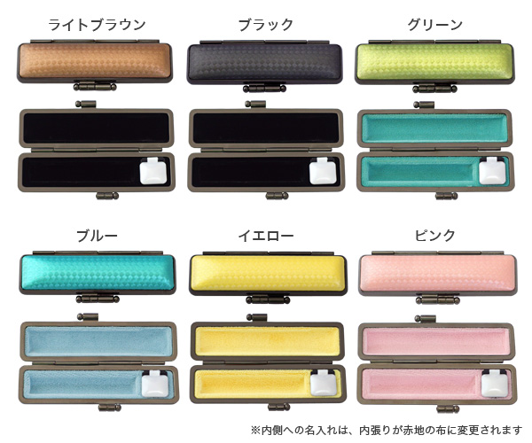 光沢のある質感が人気のカラフル印鑑ケースです。合わせて12色の中からお好きな色を組み合わせてご注文頂けます。黒檀(こくたん)やカラフルな印材に合わせやすく、ご予算的にも卒業記念品にオススメしやすい印鑑ケースです。