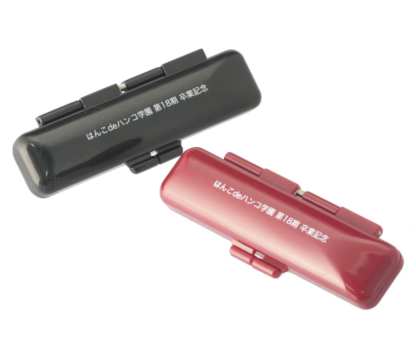 プラスチック製の中では人気の高い、卒業記念品用の印鑑ケースです。鮮やかな6色からお選びいただくことができ、ケースの表面に学校名を名入れすることができます。企業・法人のノベルティなどにも多数採用されている人気の印鑑ケースです。