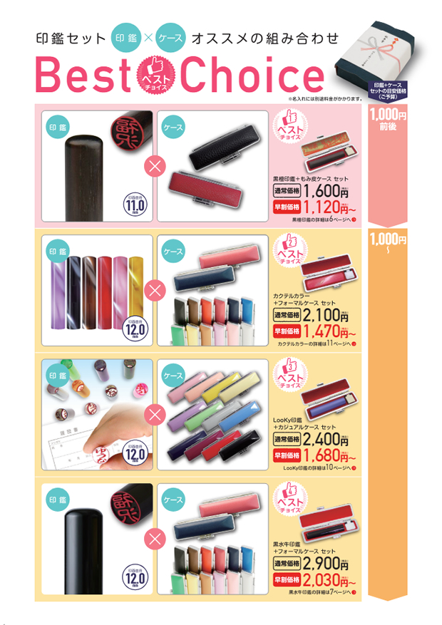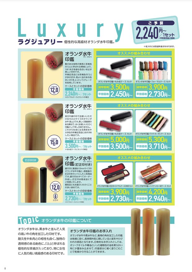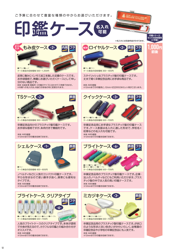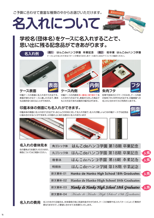 はんこdeハンコの卒業記念品印鑑カタログ(改訂版)をダウンロードいただけます。記念品のラインナップやお申込みの流れなどをコンパクトにまとめています。A4用紙16枚で印刷できますので、皆様でのお打ち合わせの際にご活用下さい。FAXでのお見積もり依頼も受け付けております。 なお、印刷された冊子をご希望のお客様は、お電話かメールにてお知らせ下さい。